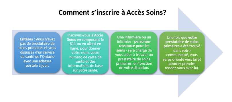 Les personnes qui désirent s’inscrire à Accès Soins peuvent suivre l’une des deux façons suivantes : en ligne ou par téléphone au 811, accessible jour et nuit.